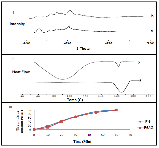 Fig. 6: (I) XRD pattern of (a) freshly prepared solid dispersion (SD 1:5:1) (b) aged solid dispersion (SD1:5:1) after 3 mo of storage in 40 °C and 75%RH. (II) DSC thermograms of (a) Freshly prepared solid dispersion (SD 1:5:1) (b) Aged solid dispersion (SD 1:5:1) after 3 mo of storage in 40 °C and 75%RH. (III) Release profile of freshly prepared solid dispersion (SD 1:5:1) and aged solid dispersion (SD 1:5:1) after 3 mo of storage in 40 °C and 75% RH (mean±SD, n=3)