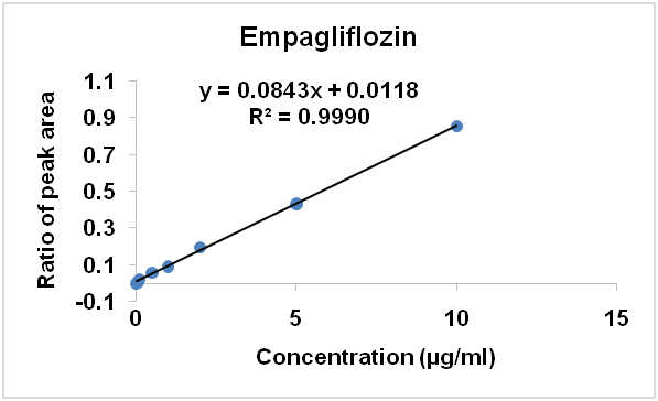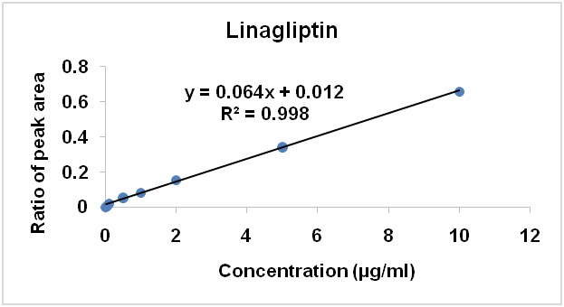 The ratio of peak area of the analyte to internal standard was used for the construction of calibration curve. The linearity of both analytes was established by eight-point calibration curve, concentration ranging from 0.01 to 10µg/ml. The most variable regression equation of the calibration curve for empagliflozin and linagliptin was y = 0.084x+0.01 and y = 0.0652x+0.0105 respectively. The linearity of the calibration graph was validated by the high value of the correlation coefficient with an average value of 0.999. The standard curve of empagliflozin and linagliptin are presented in fig. 4 and fig. 5.
