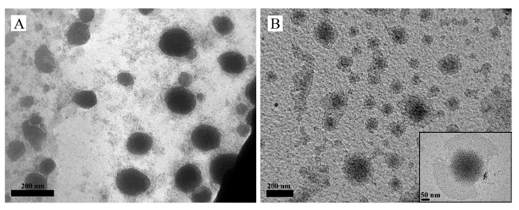 Fig. 1: TEM micrographs of (A) IND-NLC2 and (B) IND-NLC2-PEG