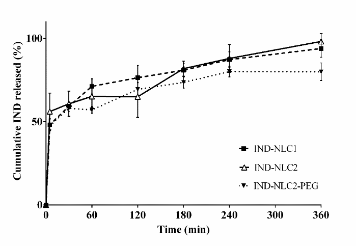 However, after the burst release, the release profile could be the best fit to the Higuchi square root model. This indicates that IND released from the NLCs in the second phase occurs by a diffusion-controlled mechanism from oil nano-compartment to the matrix for subsequent release to the medium. Also, the release of IND-NLC2 coated with PEG, an uncharged hydrophilic polymer, is slightly reduced possibly due to the presence of the polymer in the outer regions of the particles.