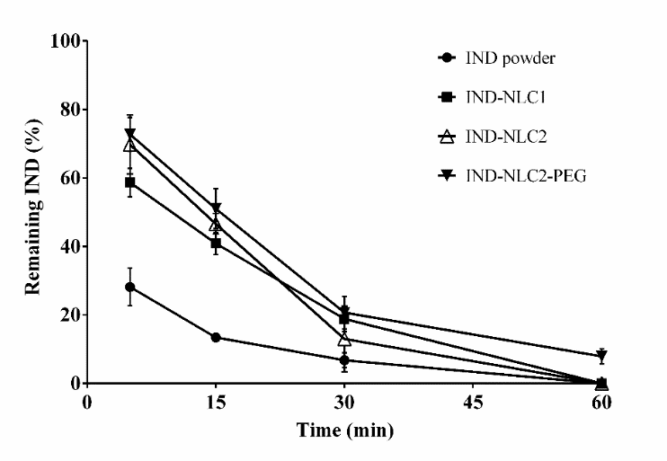 Table 2 showed the effect of different solid lipids, surfactants, and PEG coating on the physical characteristics of IND-NLCs. Compared to blank NLCs, IND-NLCs were slightly larger (p<0.05). However, IND loading showed no significant influence on the zeta potential and PI (p>0.05). The entrapment efficiency (EE) of IND-NLC1, IND-NLC2, and IND-NLC2-PEG was 74.11±2.81, 65.09±3.16, and 62.75±4.10, respectively.