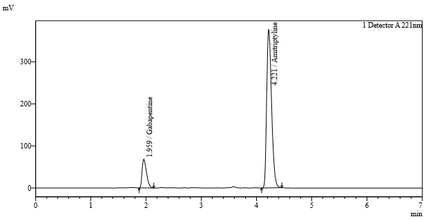 Results: The retention time of gabapentin and amitriptyline hydrochloride was found to be 1.959 min and 4.221 min respectively. The linearity of gabapentin was found in the range of 720-1680 ppm and that for amitriptyline hydrochloride was found to be 24-56 ppm. The correlation coefficient for gabapentin and amitriptyline hydrochloride were 0.999 and 0.9963 respectively. The high recovery values (98%-101%) indicate a satisfactory accuracy. The low percent relative standard deviation (% RSD) values in the precision study reveals that the method is precise.