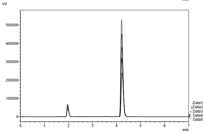 Fig. 7: Chromatogram of gabapentin and amitriptyline hydrochloride (five different concentration overlapped for linearity study)