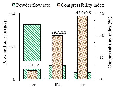 Fig. 1 shows the flow properties of the powder of the materials used in the formulation of IBU tablets. The flow properties of the powder were determined by assessing the flow through an orifice and the compressibility index of the powder (CI). Both parameters agree to show intermediate rheological properties of IBU (CI=29.7%±3.3%), in comparison with those of PVP (CI=6.1%±1.2%) and CP (CI=42.9±0.6%). According to the powder compressibility index, both IBU as well as CP showed unsatisfactory rheological properties. As stated by the scale of flowability of powders, IBU displayed a poor powder flow, while CP showed a very poor powder flow.