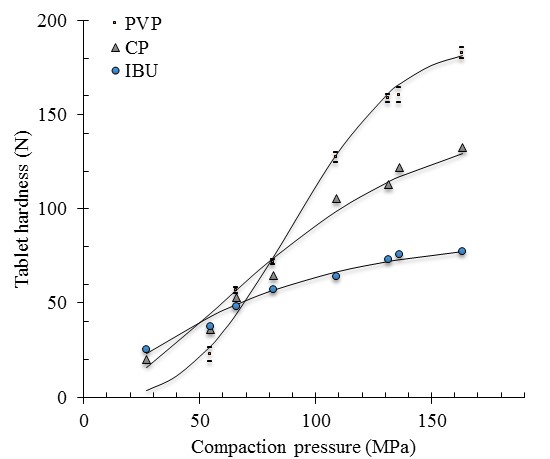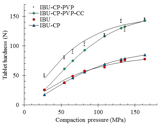 Fig. 2 describes the characteristics of compactibility of the active principle and that of the two excipients to be used. The curves of compactibility showed the increase of the tablet hardness as the compaction pressure increased. The PVP compactibility curve shows the experimental points, their standard deviation and the calculated regression. PVP showed the highest compactibility, followed by CP while IBU showed the lowest capacity to form coherent tablets.