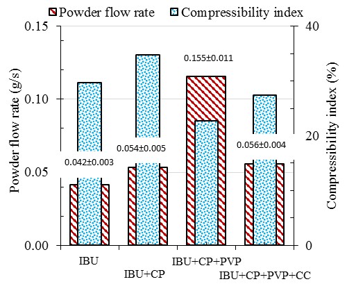 Fig. 3 shows the effect of the different excipients on the flowability of the IBU powder. The powder mixtures were composed of equal parts of the components while the CC was added in a proportion of 10%. As can be expected from the data of the excipients, CP increased the compressibility index of IBU, which means a lower flowability of the mixture. The subsequent addition of PVP reduced the compressibility index, improving the flow properties of the mixture. The final addition of CC to the aforementioned mixture again increased the compressibility index of the powder, reducing its flowability, to almost the same level as IBU alone. The poor flow properties of the powder blend generated by an excipient (CP) can be compensated by the addition of a more fluid powder (PVP).