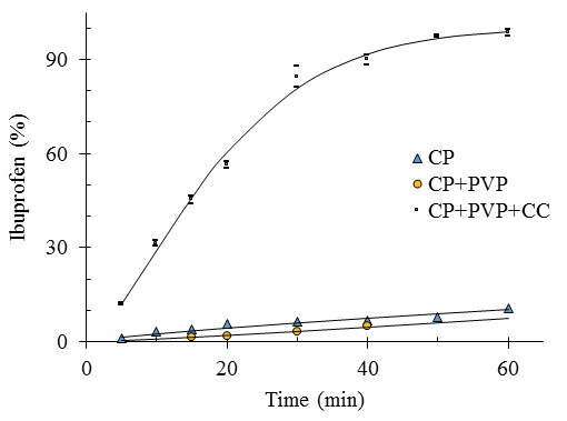 Results: The very poor flowability of CP and the high compactibility of PVP were transferred to the powder mixtures, which showed poor flowability, and ibuprofen tablets with twice the compactibility. The tablets disintegration was high with a low proportion of CC (0.5%), but decreased linearly by increasing the proportion of the disintegrant up to 10%. At the same time, the dissolution of the drug after 30 min increased from 3% to 80%. The agglomeration of CP through the deposition of an alcoholic solution of the drug and PVP improved the flow properties and tripled the hardness of the tablets. However, the dissolution after 30 min decreased from 80% to 18%.