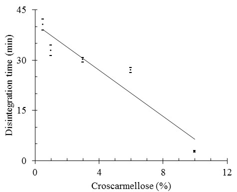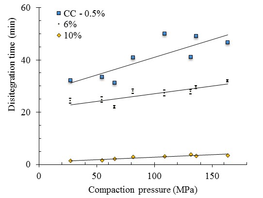 The progressive increase in the proportion of CC up to 10% linearly decreased the disintegration time of the tablets, although other studies have found an increase in the disintegration time of the tablets after exceeding a threshold proportion of the disintegrant.