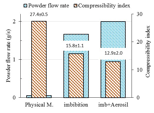 The technological properties of the materials are transferred to their powder mixtures and their tablets. The poor technological properties of a material can be compensated by adding another with better functionality.