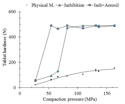 The use of a combination of a material that deforms plastically with another that fragments should guarantee a greater compactibility. It seems that the mixture can have advantages over the individual materials. The inclusion of Aerosil in the formulation increased the previous effect facilitating the sliding of the particles during compression.