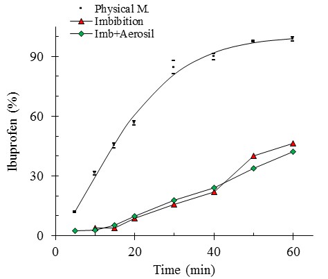 Unlike other reports, the formation of a solid dispersion of IBU-PVP, by imbibition or deposition on an adsorbent, did not improve the dissolution but deteriorated it. This was attributed to a significant increase in the compaction capacity of the agglomerated material, forming a matrix of PVP that dissolves rather than disintegrates.