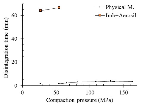Although a higher dissolution rate of the solid dispersions of ibuprofen in PVP has been observed, this has been observed in samples in powder form [26]. Currently, the compaction process had a negative influence on the dissolution. The tablets obtained showed a high mechanical strength and behaved plastically, which significantly increased the disintegration time (fig. 11). The tablets obtained with solid dispersions formed a matrix of PVP that rather dissolves instead of disintegrating.