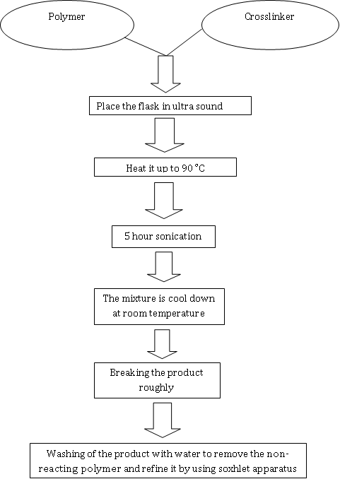 Polymers are made to react with crosslinkers in a flask without the solvent. The flask is placed in an ultrasound bath which is filled with water and heated up to 90˚C and the mixture is sonicated for 5 h. Then the mixture is cooled down to room temperature and then the product is broken into rough pieces. At last, the non-reacting polymer is removed by washing the product with water and refining is done using soxhlet apparatus (ethanol) to obtain nanosponges [10].