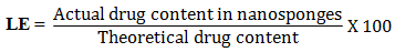 The loading efficiency of a nanosponge particle can be determined by the estimation of drug loaded into the nanosponge using UV spectrophotometer and high-performance liquid chromatography method for the nanosponges. The loading efficiency of nanosponges can be calculated by using the following equation.