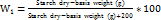 A = Sample weight (g), a = Sediment weight in tube (g), b = Weight of residue in Petri dish (solubilized starch, g), W1 = Percentage of dry-basis starch in suspension, W2 = Starch in each sample, % SS = Soluble solids percentage (g/starch g) y SP = Swelling power.