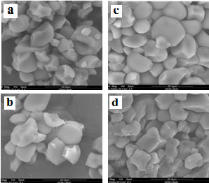 Fig. 2: Microphotographs of A. xanthorrhiza starch (5000x): a) Native, b) Acetylation level I, c) acetylation level II, d) acetylation level III