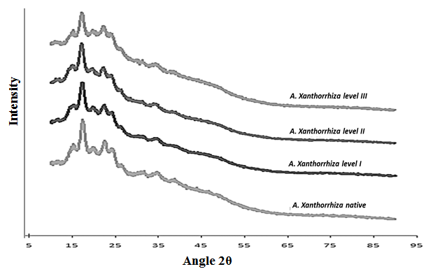 Fig. 3: X ray powder diffraction study of native A. xanthorrhiza starch and A. xanthorrhiza starch with three levels of acetylation (Levels I, II and III)