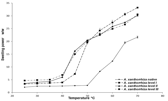 Fig. 4 shows that SP increases as the temperature rises which matches postulations of Li and Yeh [31], as it comes closer to gel formation. At this point, native starch can retain 16.20±0.22 times its own weight in water, while starches modified on levels I, II and III, present values of 22.93±2.48, 26.77±0.15 and 24.98±2.67, respectively at 65 °C (These values correspond to mean=3±SD). This increase occurs at the low level of acetylation, because inclusion of acetyl groups in the polymer chains that confirm the starch, causes an intragranular disruption that enables permeation of water to the amorphous region, which is eased by the greater energy supplied. Accordingly, more water is absorbed which translates into greater swelling [20, 32].
