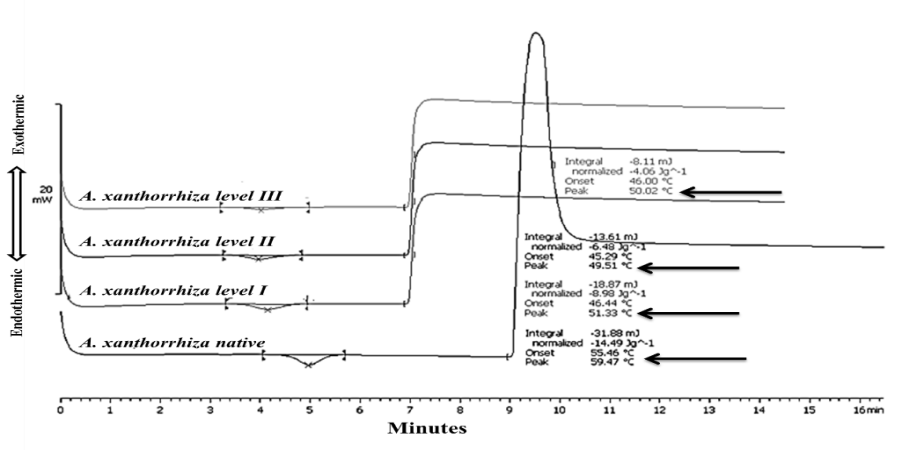Fig. 5: Thermograms of native A. xanthorrhiza starch and A. xanthorrhiza starch with three levels of acetylation (Levels I, II and III)