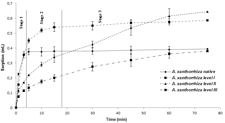 The sorption graphs show that A. xanthorrhiza native and acetylation level I starches both present a two-phase behavior characterized by high-speed on the first stage that decreases over time. For level I starch, sorption velocity constants are greater than those of native starch, which means a more hydrophilic material, albeit with less capacity to increase its surroundings viscosity. Acetylation levels II and III starches presented higher water sorption, albeit slower than native and level I starches. It could be because, at neutral or high pH values, the ionization of carboxyl groups and the consequent repulsion between chains with network dilation, which favors the entry of water [39]. This outcome is attributed to material’s observed tendency of forming a superficial hydrophilic gel on the first stages of the process, which hinders water entry. This is associated to greater water sorption capacity as the acetylation degree increases when substitution degree is low [20]. Different behavior occurs at high levels of acetylation, as it has been reported by other authors [20].