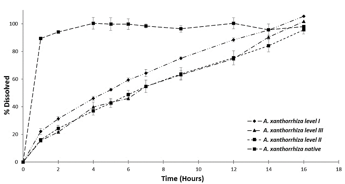 Given that profiles are deemed similar when f2 ranges between 50 and 100 [44], profiles for acetylation levels II and III are found inside the range, and their comparison with other levels shows no similarity between them. These results clearly evidence that acetylation of A. xanthorrhiza starch alters the physicochemical behaviour of native starch, generating a new material capable of controlling drug release, as shown in drug-release profiles with statistically-significative differences in comparison to native starch. Similarity shown for levels II and III implies that a low level of acetylation be enough for controlling drug release.