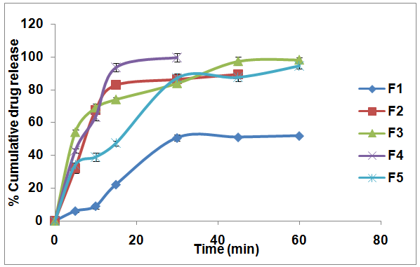 Fig. 2: In vitro drug dissolution for formulations F1-F5