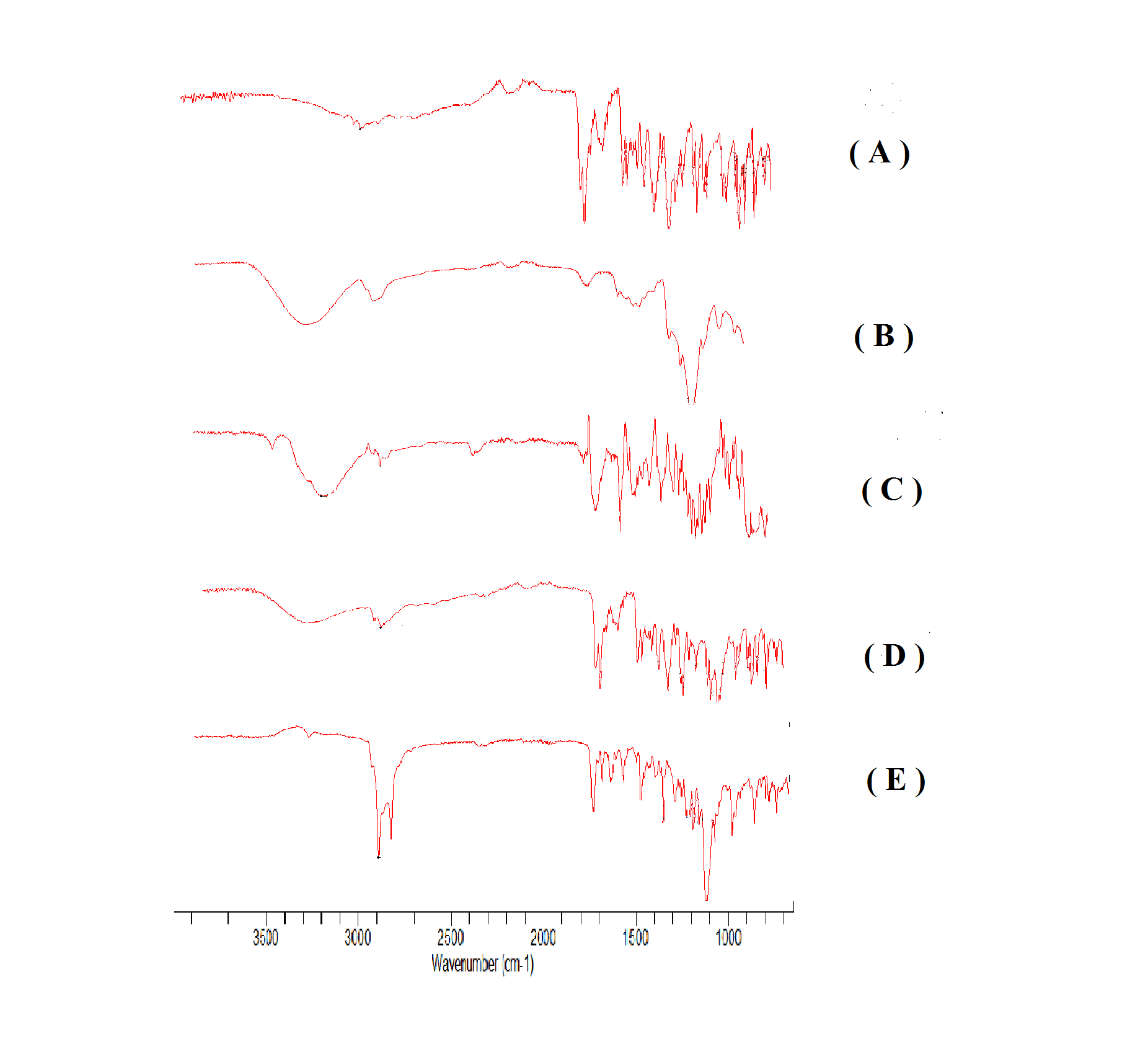 Fig. 4: FTIR overlay spectrogram of (A) Indomethacin, (B) HP β-CD, (C) PEG 6000, (D) drug inclusion complex with HP β-CD and (E) solid dispersion with PEG 6000