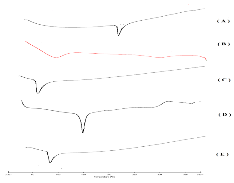 Fig. 5: DSC thermogram overlay of (A) Indomethacin, (B) HP β-CD, (C) PEG 6000, (D) drug inclusion complex with HP β-CD and (E) solid dispersion with PEG 6000