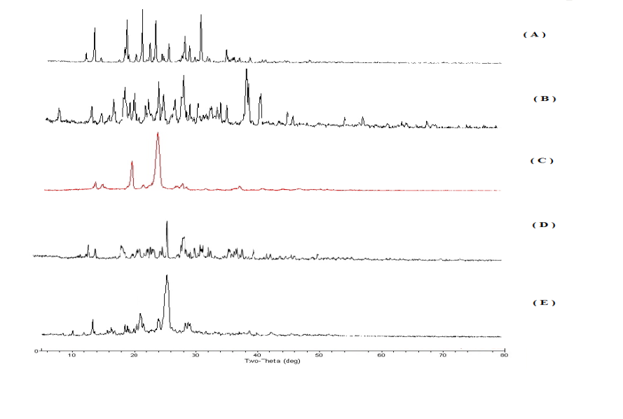 Fig. 6: XRD overlay of (A) Indomethacin, (B) HP β-CD, (C) PEG 6000, (D) drug inclusion complex with HP β-CD and (E) solid dispersion with PEG 6000