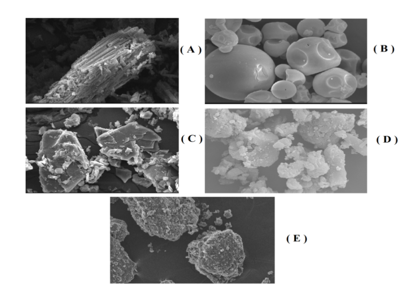 Fig. 7: SEM of (A) Indomethacin, (B) HP β-CD, (C) PEG 6000, (D) drug inclusion complex with HP β-CD and (E) solid dispersion with PEG 6000