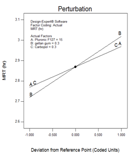 Perturbation graph was plotted to determine the factors which mostly affect the response. A high slope or curvature in perturbation graph indicates sensitivity against specific factor whereas, a relatively flat line indicates the less sensitivity towards that factor. In case of response y1 (MRT) factor B showed high slope that indicates higher sensitivity towards factor C, whereas factor A and C possesses relatively less slope indicating lesser sensitivity for response y1 (fig. 1). For response y2, factor A showed a steep slope and factor B, and C shows slight slop indicating a limited effect on response y2 (fig. 2). Moreover, for response y3 factor B and C represented a significant relation, whereas factor A showed very less slope than factor B and C, indicating the lesser effect on response y3 (fig. 3).