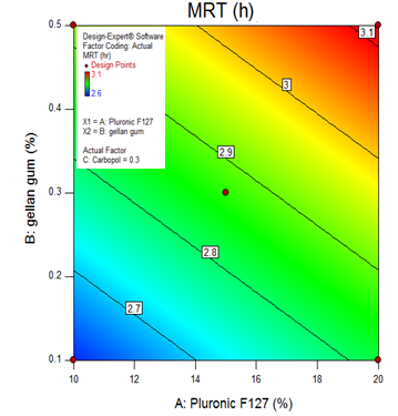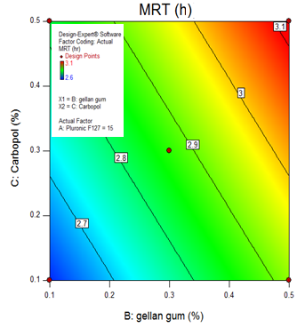 Analysis of variance (ANOVA) was applicable to determine the effect of many variables and their interaction. The regression model was used to develop contour plots of independent factors. The ANOVA table affirms the competence of the liner model (Model Prob>F is less than 0.05). It also determines the powerful factors that affect the response y1, y2 and y3 of the formulation. For MRT, the concentration of gellan-gum played a significant role, followed by other 2 factors.