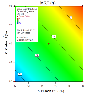 Fig. 5: Contour plot of the effect of pluronic F-127 (A) and carbopol (C) on MRT