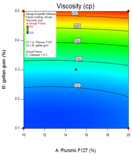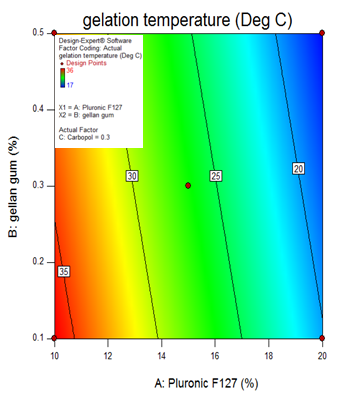 Independent variables including pluronic F-127, carbopol and gellan-gum were evaluated for their final effect on MRT, gelation temperature and viscosity. Total 13 experiments were conducted and the response data were generated in according to Box-Behnken design (table 3).