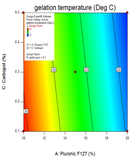 Fig. 8: Contour plot of the effect of pluronic F-127 (A) and carbopol (C) on gelation temperature