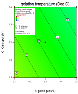 Fig. 9: Contour plot of the effect of gellan-gum (B) and carbopol (C) on gelation temperature