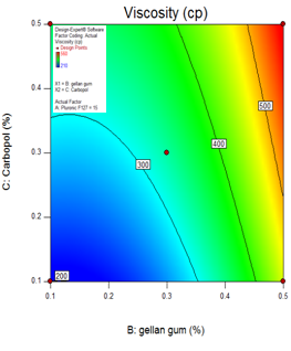Fig. 12: Contour plot of the effect of gellan-gum (B) and carbopol (C) on the viscosity