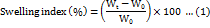 The extent of swelling was measured in terms of % of weight gained by the tablet that may be used to predict drug release behaviour from the tablets. One tablet from each formulation was weighed and kept in a petri dish containing 50 ml of 0.1 N HCl solution. At the end of specified time intervals, tablets were withdrawn from a petri dish, excess buffer blotted with tissue paper and weighed. The % of weight gained (swelling index) was calculated by using following formula (Eq 1) [16].
