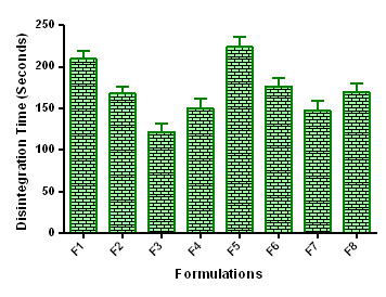 Fig. 1: Disintegration time of TH immediate release tablet formulations (Results are expressed as mean±SD, n=3)