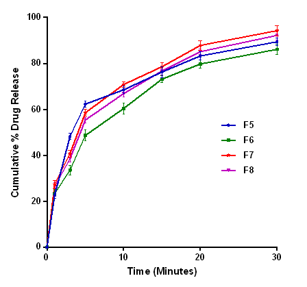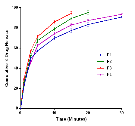 In vitro drug release at 1, 3, 5, 10, 15, 20 and 30 min for all batches was expressed by a graph cumulative % drug released vs time (fig. 2). The release of TH was depended on its concentration in the IR tablet formulation and therefore followed first-order release kinetics.