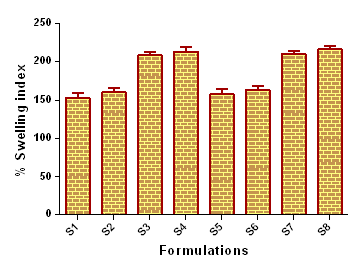Fig. 3: % Swelling index of GBP buoyant SR tablet formulations (Results are expressed as mean±SD, n=3)
