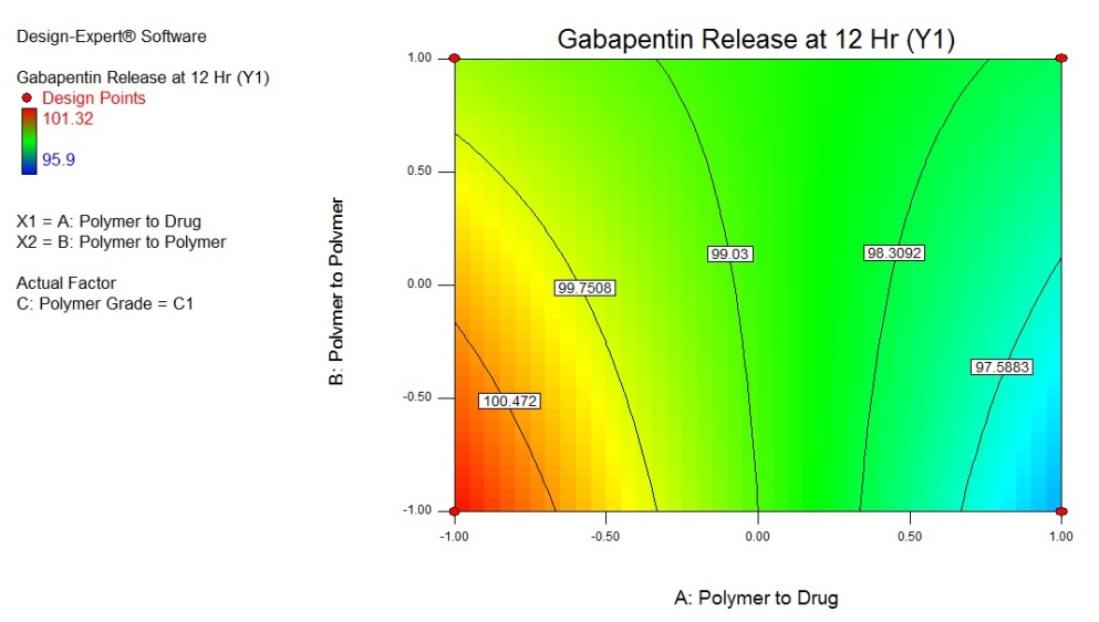 Optimization of the process was made to get reactions Y1, Y2, Y3 and Y4 through incepted polynomial equations. The selected formulation was arrived through optimizing the amount of GBP release at 12 h; increasing buoyancy time and T50 % to find the preferred quantities of total polymer-to-drug proportion (X1), the polymer-to-polymer proportion (X2) and polymer grade (X3). Contour plot for GBP release at 12 h (Y1); (fig. 5) demonstrated the relationship with controlled variables. Findings of the optimization process indicated ideal experimental setup; (2:1) proportion of total polymer content-to-drug content and polymer-to-polymer proportion (1:1) whereas carbopol (934 and 940) polymer viscosity grades did not significantly affect the performance of the tablet dosage form.