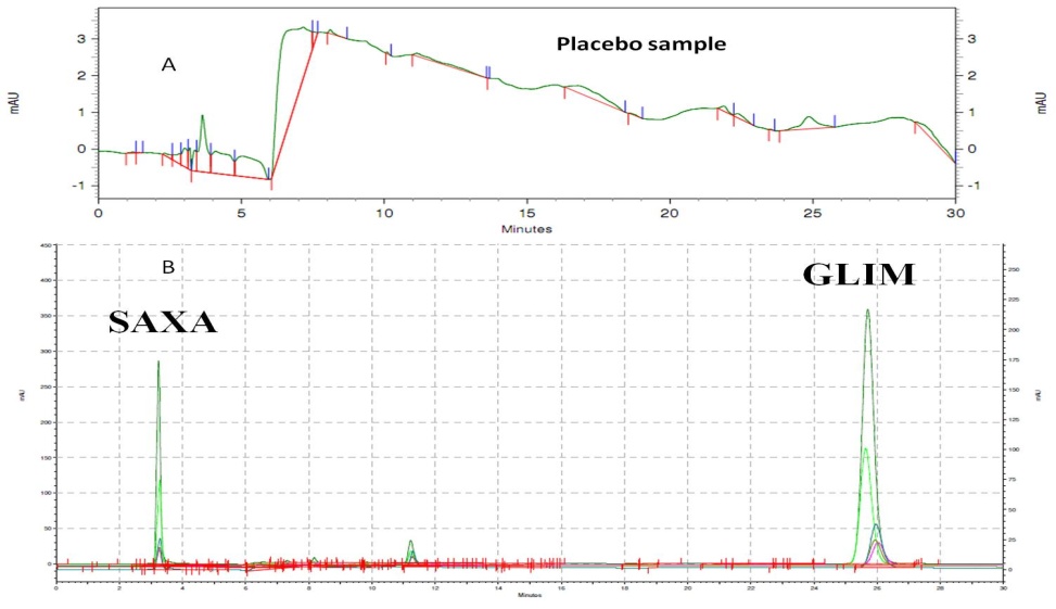 Fig. 2 revealed that there was no interference in the chromatograms of SAXA and GLIM, with any of the peaks of placebo. None of the peaks of excipients observed at the same retention time of SAXA and GLIM. The resolution obtained between SAXA and GLIM was quite good, i.e., 3.28 min for SAXA and 26.13 min for GLIM.