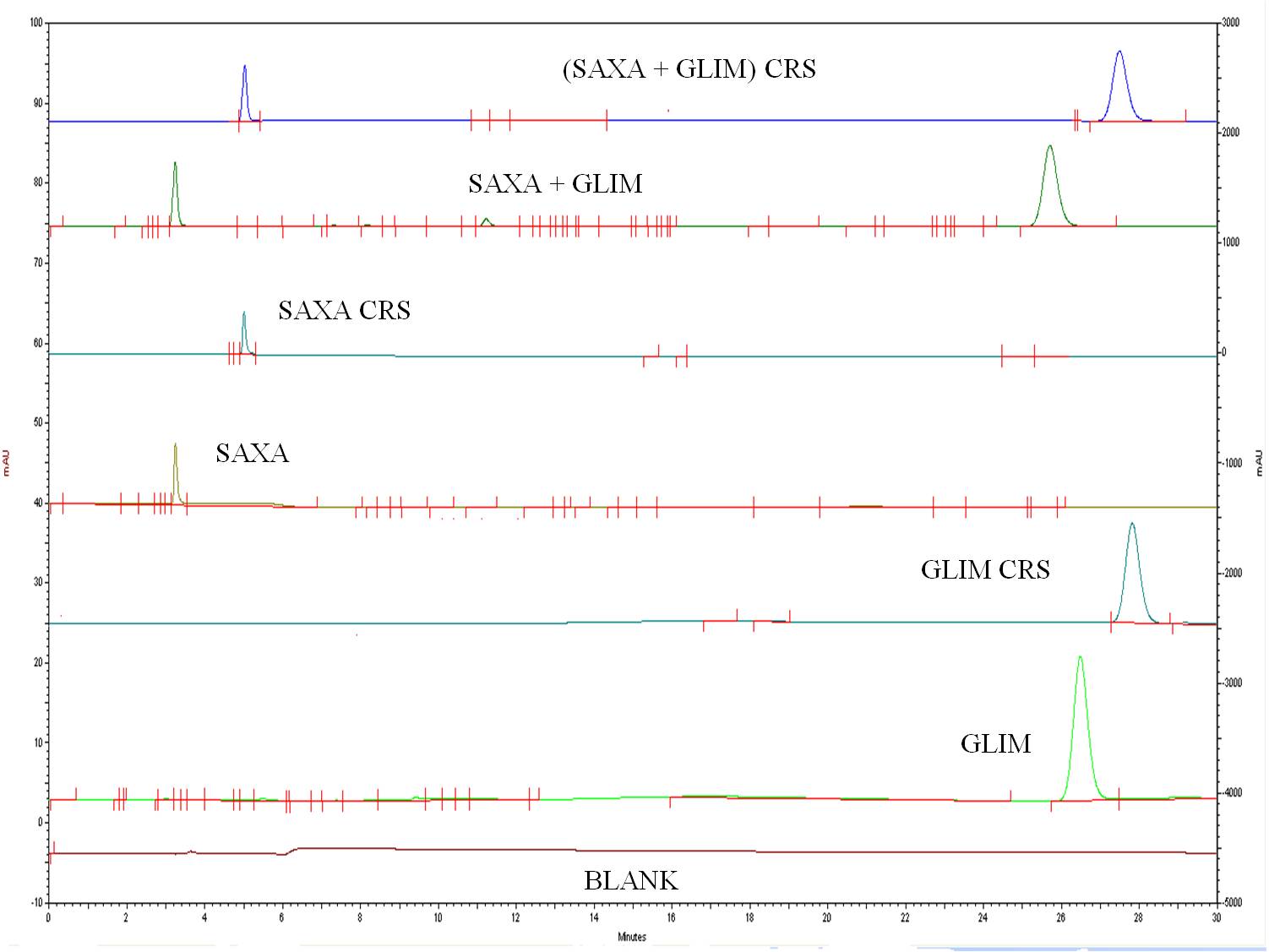 For the specificity study, identification of the active drugs, i.e., SAXA and GLIM was studied individually, and simultaneously, by comparing the raw material (mobile phase+SAXA, mobile phase+GLIM and mobile phase+SAXA+GLIM) with a standard of their respective references (mobile phase+SAXA CRS, mobile phase+GLIM CRS, and mobile phase+SAXA CRS+GLIM CRS).