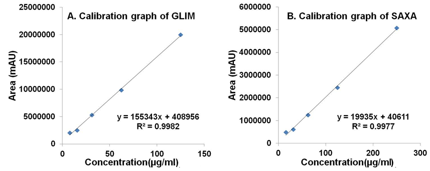 Separate standard solutions of SAXA and GLIM, were prepared at a concentration of 500 µg/ml, and 250 µg/ml respectively, dissolving the appropriated amount of bulk material in ACN. By adding an equal ratio of SAXA and GLIM solutions, a simultaneous stock solution was prepared, wherein the final concentrations of SAXA and GLIM, were 250 µg/ml, and 125 µg/ml, respectively. Further five levels in the range of, 15.63-250 µg/ml for SAXA and 7.81-125 µg/ml for GLIM, were prepared by diluting the stock solutions appropriately with ACN. All drug samples were protected from the light by employing amber coloured glass vials.