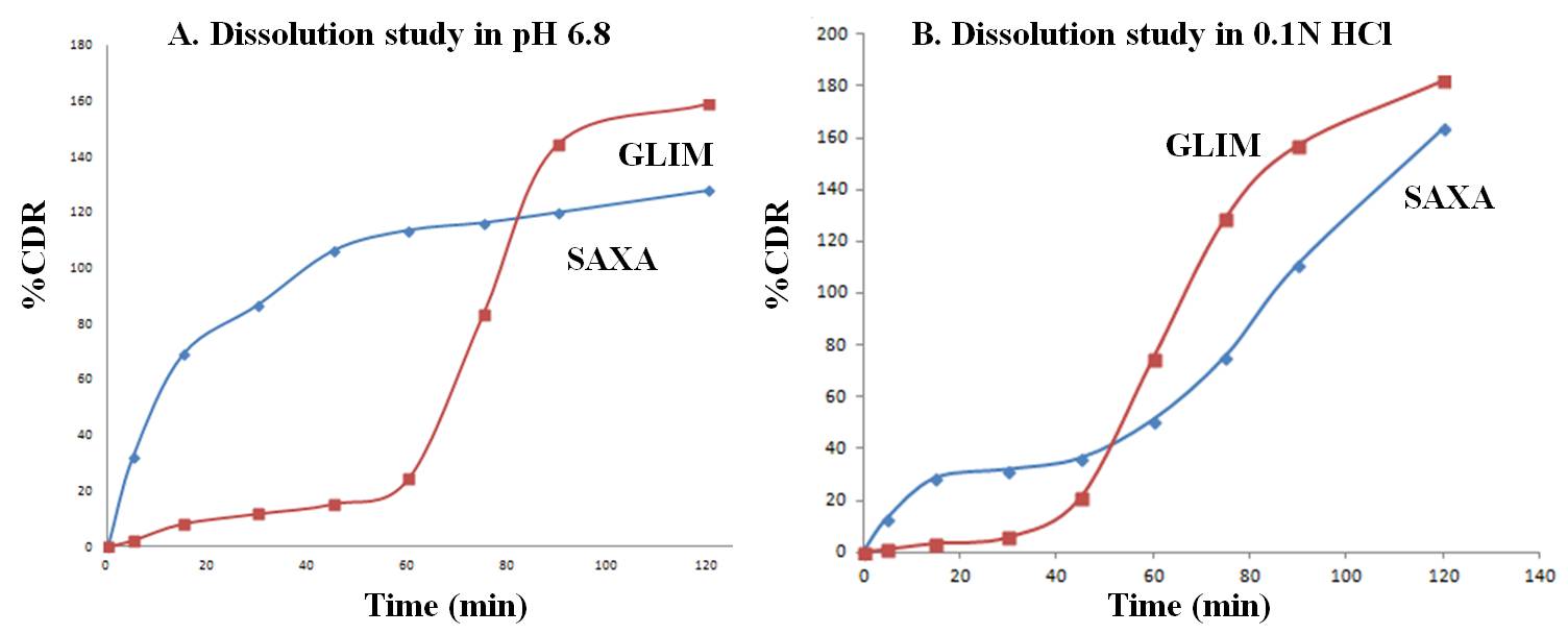 In 0.1N HCL both the drugs showed up quite a good release up to 90 min. The % CDR was 97 % for SAXA and 96.68 % for GLIM, which is indicating the complete drug release in 0.1N HCl.