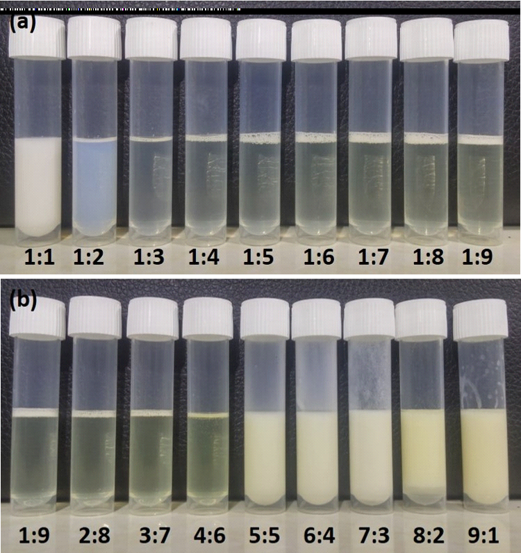 Fig.2: Visual appearance of formulations from lemongrass oil/tween 20/water: Formulations with LG oil: surfactant ratio (a) 1:1 to 1:9 (b) 1:9 to 9:1