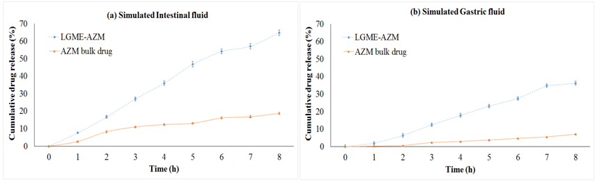 Fig.4: Cumulative drug release (%) of LGME-AZM and AZM pure drug suspension in relevant dissolution medium (a) Simulated intestinal fluid (b) Simulated gastric fluid