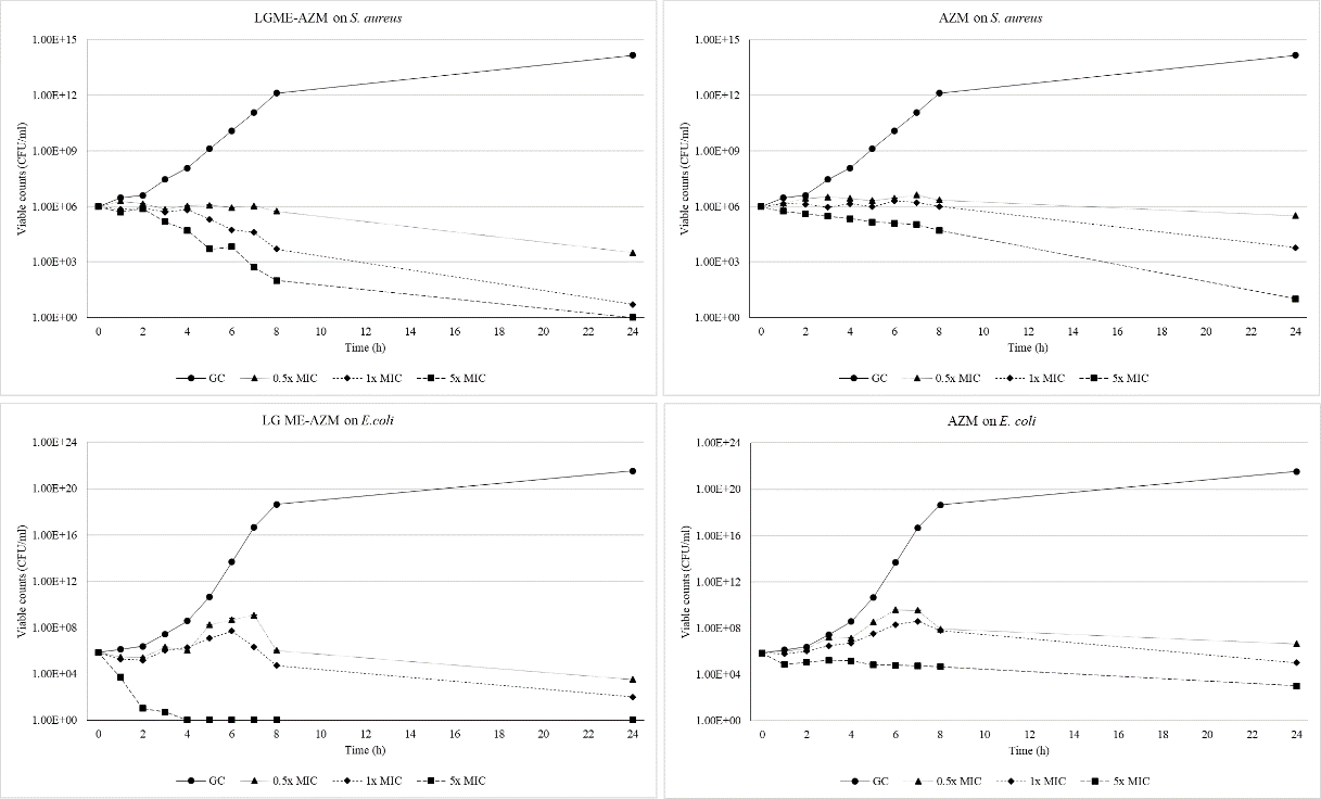 Time-Kill assay also known as the suspension time-killanalysis determines the in vitro antimicrobial activity of the test sample in relation to time. AZM bulk suspension and LGME-AZM were tested against each bacterial strain (inocula similar to MIC inocula) at 0.5x, 1x and 5x MIC. The viability of treated strains and suitable controls were determined by dilution and plating onto sterile BHI Brain heart infusion (BHI) agar plates incubated overnight at 37±1 °C.