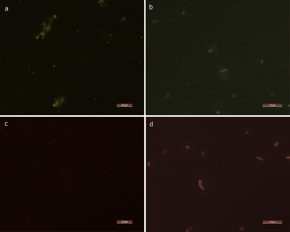 Fig.6: Fluorescent micrographs of AO and EtBr double-stained bacterial strains to access the cell viability (i) Bacterial strains without treatment (control): (a) S.aureus, and (b) E. coli. (ii) Bacterial strains treated with 1x MIC of LGME-AZM (1:4) (c) S. aureus(d) E. coli